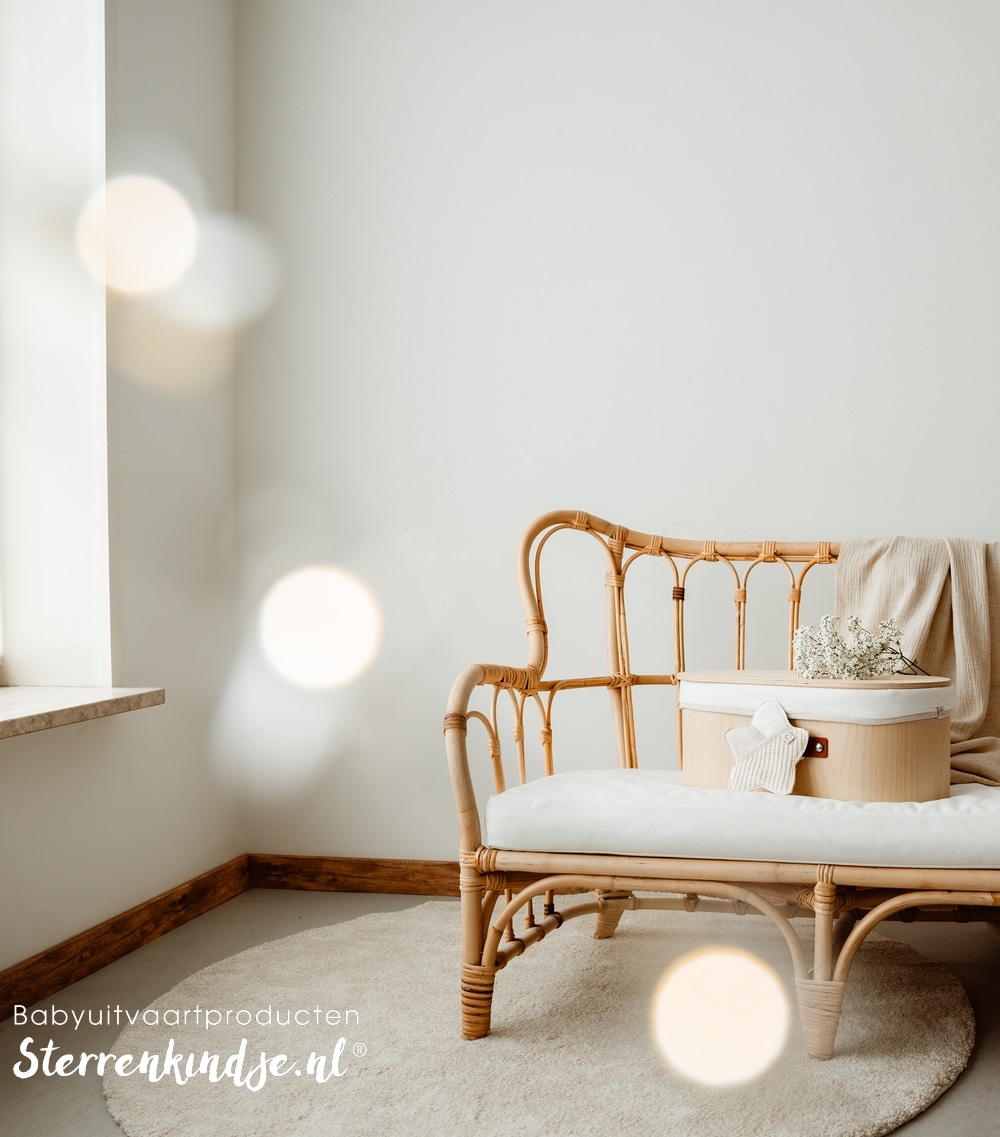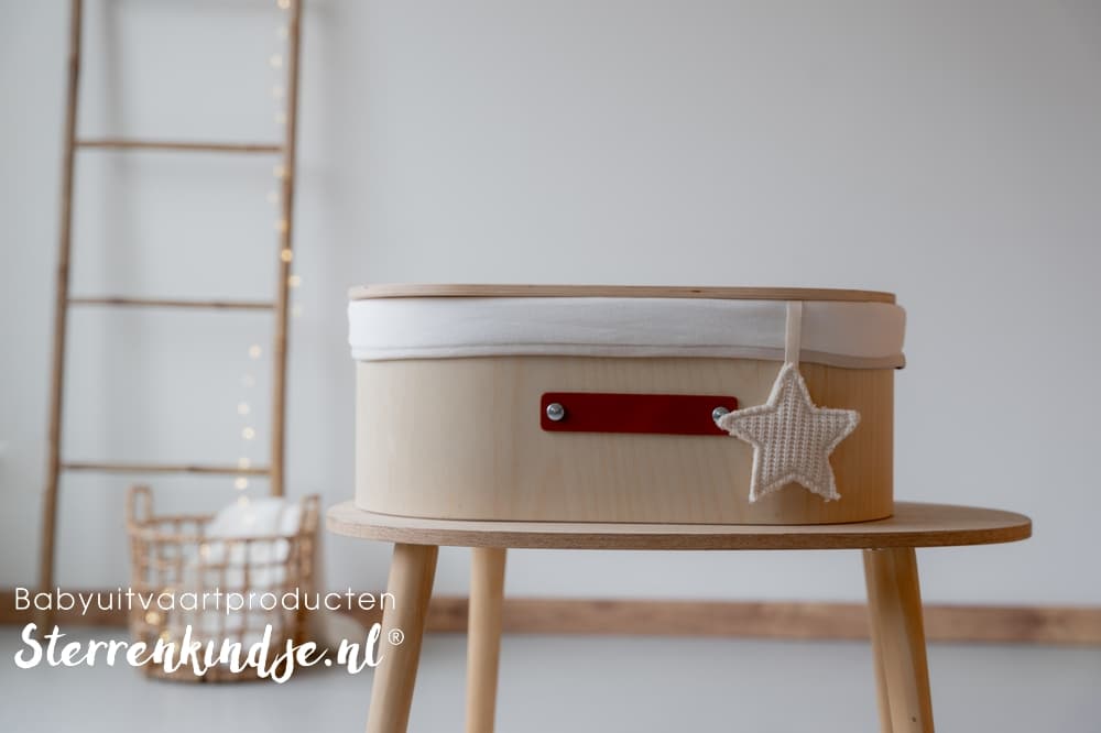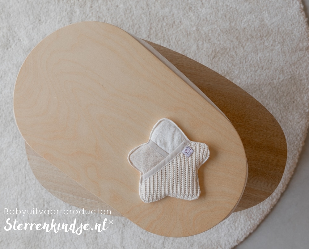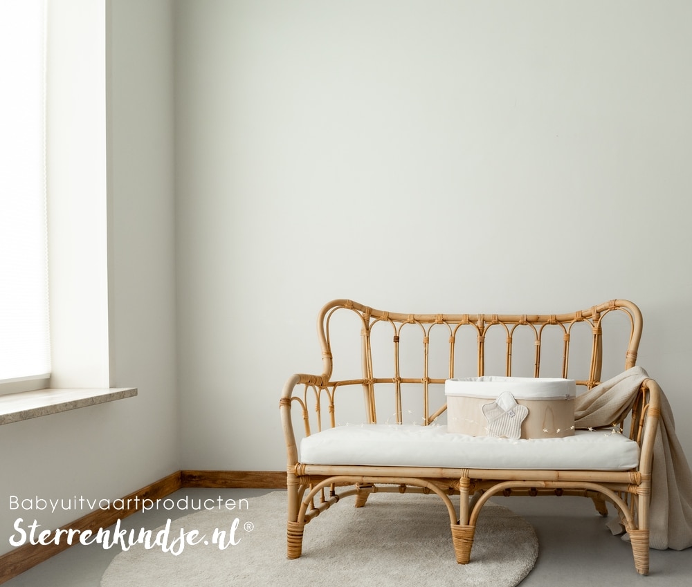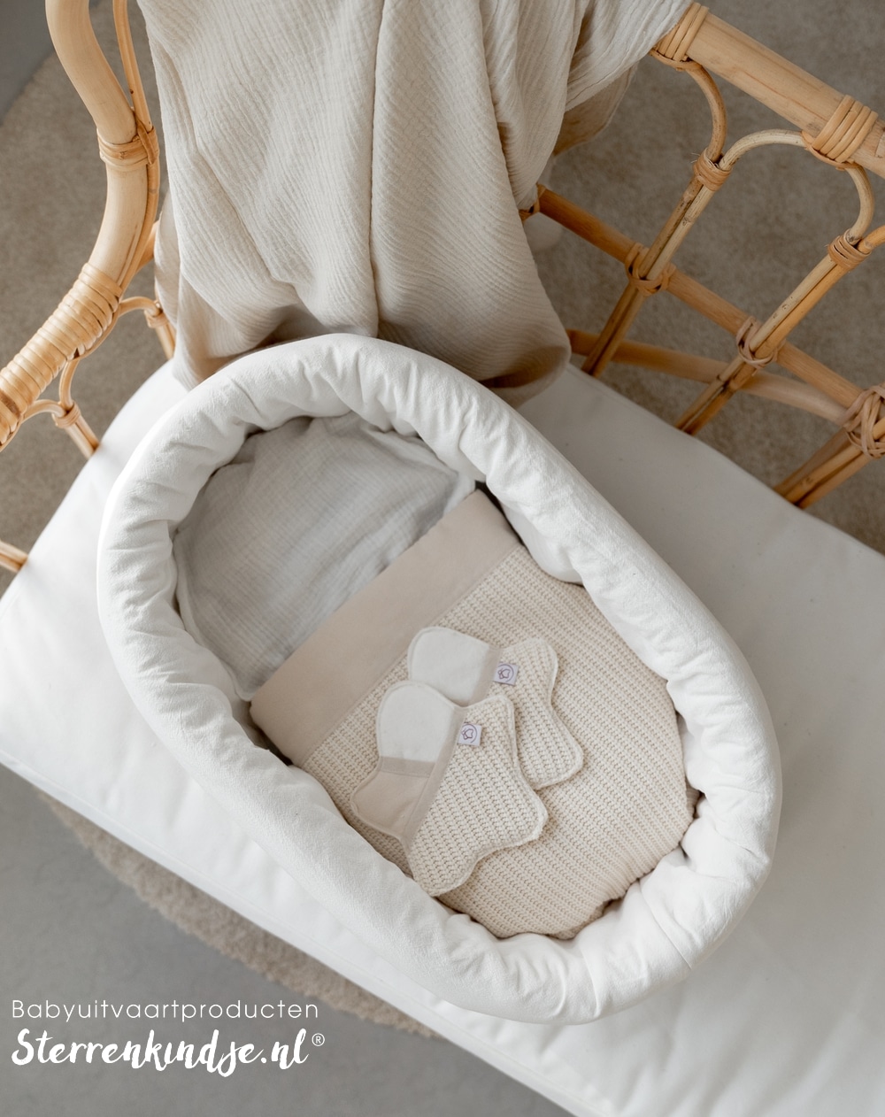 Dit is een kistje van onbehandeld berkenhout dat heel zacht aanvoelt. Als je wilt, kan er op geschreven, geschilderd of getekend worden. Het kistje wordt geleverd met bekleding, matrasje, lakendekentje, twee herinneringssterren en een kleine ster. Samengesteld in de kleuren offwhite (zand) en lichtbeige (kiezel), zachte, warme moderne stoffen die troost geven.