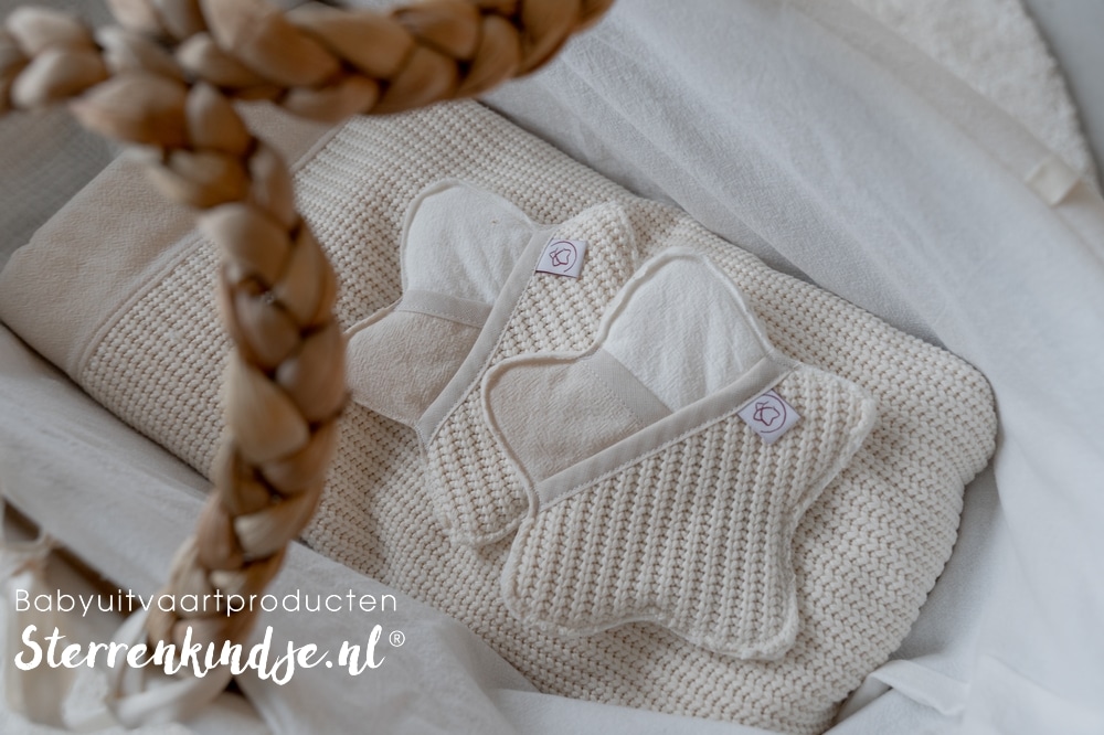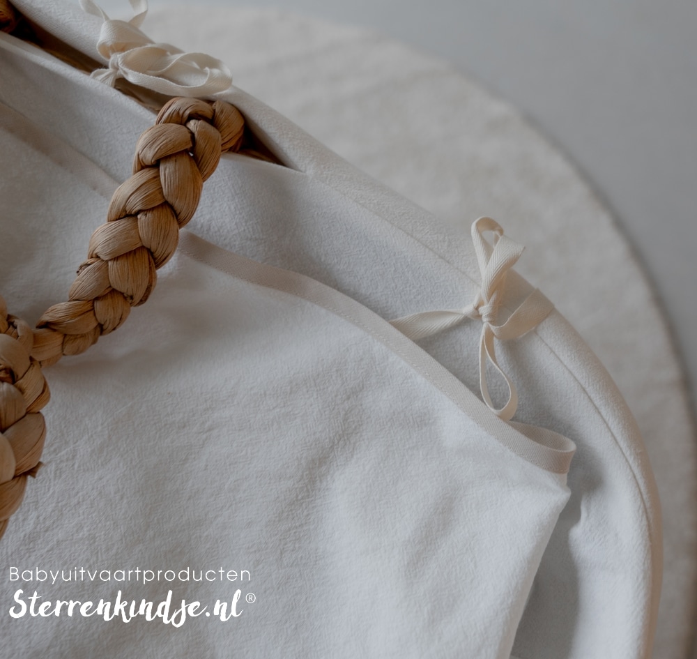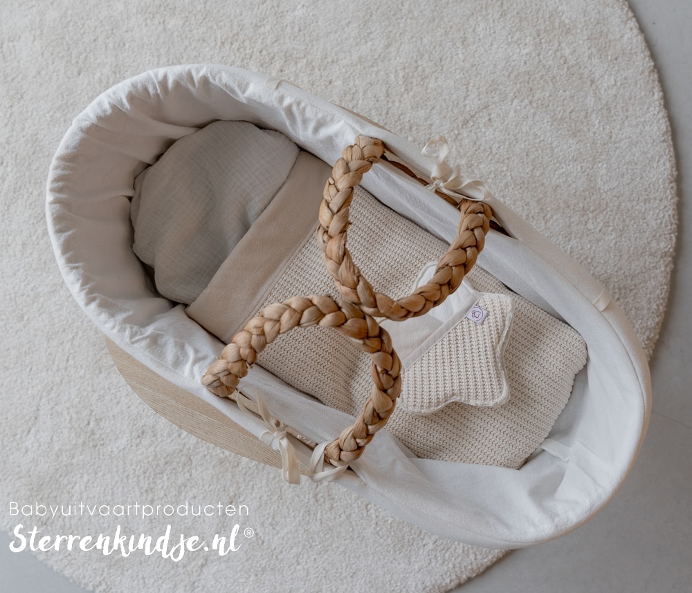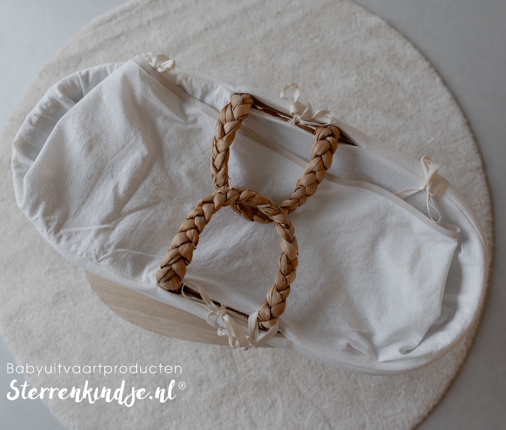De mand wordt geleverd met bekleding, een matrasje, lakendekentje, twee herinneringssterren en een kleine ster. Samengesteld in de kleuren offwhite (zand) en lichtbeige (kiezel), zachte, warme moderne stoffen die troost geven. Je sluit de bekleding met sluitlinten.